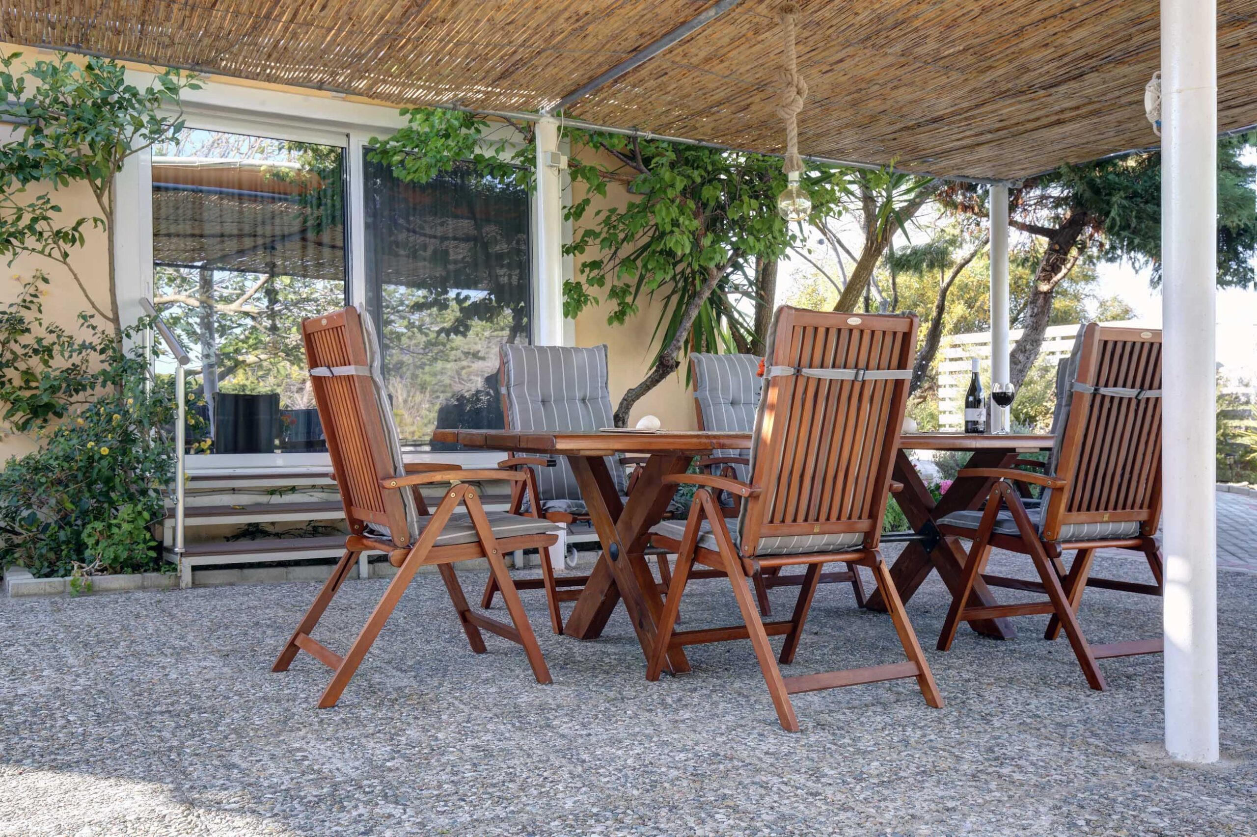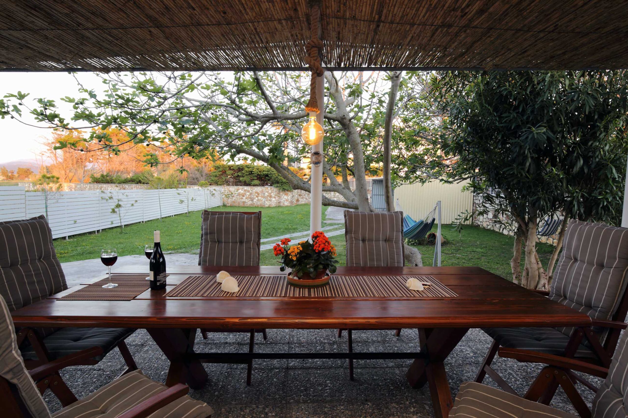 At the pergola area, stands a large wooden table with comfy chairs, where you can have fun doing BBQ, rest after your swimming time, enjoy the beautiful sunset or relax during the night.